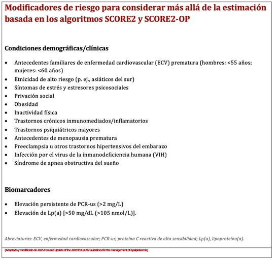 El Grupo de Trabajo de la actualización nos recuerda que los modelos poblacionales existentes de riesgo cardiovascular son herramientas relativamente imprecisas para la predicción individual, es razonable prestar atención a características adicionales que se sabe aumentan el riesgo cardiovascular, con el fin de refinar la evaluación de riesgo. Las condiciones clínicas y biomarcadores seleccionados que pueden considerarse modificadores de riesgo. Su presencia puede respaldar la reclasificación de un individuo a una categoría de mayor riesgo que la calculada por el algoritmo SCORE2 o SCORE2-OP, y de este modo guiar las decisiones sobre metas de LDL-C e intervenciones hipolipemiantes.