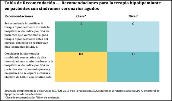 El estudio IMPROVE-IT (Improved Reduction of Outcomes: Vytorin Efficacy International Trial) demostró que la adición de ezetimiba a la terapia con estatinas (simvastatina 40 mg) dentro de los <10 días (mediana de 5 días) tras un SCA resultó en una reducción incremental de los niveles de LDL-C y en una disminución modesta pero significativa de los eventos cardiovasculares adversos. Además, datos recientes de los estudios HUYGENS (High-Resolution Assessment of Coronary Plaques in a Global Evolocumab Randomized Study) y PACMAN-AMI (Effects of the PCSK9 Antibody Alirocumab on Coronary Atherosclerosis in Patients With Acute Myocardial Infarction) informaron mejoras en el tamaño y la composición de la placa coronaria en respuesta a una reducción aguda e intensiva de LDL-C en la población vulnerable post-SCA.