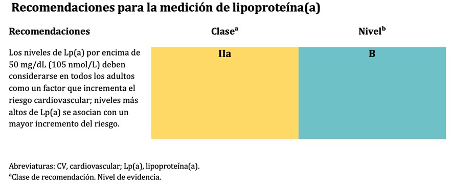 Actualmente, se considera razonable tener en cuenta niveles elevados de Lp(a) >50 mg/dL (≥105 nmol/L) (que afectan al menos al 20% de la población) para refinar la estimación del riesgo CV en todo el espectro de riesgo. Además, este punto de corte debe considerarse como un modificador de riesgo, con potencial para reclasificar la categoría de riesgo CV, particularmente en individuos con riesgo moderado o cercanos a los umbrales de decisión terapéutica.