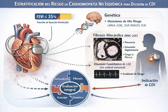 La cardiomiopatía no isquémica (CMNI) constituye un grupo heterogéneo de pacientes en quienes la estratificación del riesgo arrítmico continúa siendo un desafío clínico relevante. En este fenotipo, los modos de muerte se distribuyen fundamentalmente entre la progresión de la insuficiencia cardíaca y la muerte súbita de origen arrítmico, ambas determinantes pronósticas mayores. Este riesgo ha motivado la implantación profiláctica de cardiodesfibriladores implantables (CDI) como estrategia de prevención primaria.