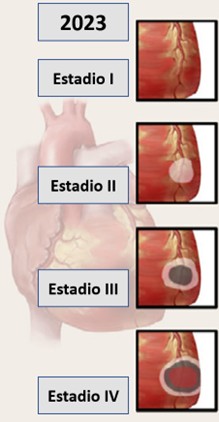 En 2023, la Sociedad Canadiense de Cardiología propuso una clasificación en cuatro estadios progresivos de lesión tisular: