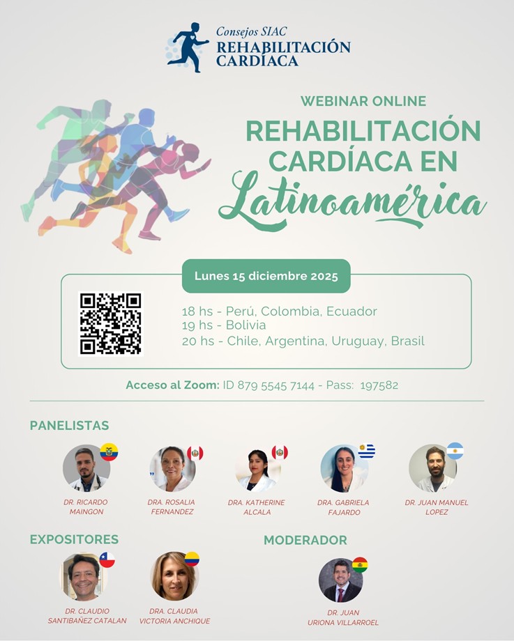 Webinar Rehabilitación Cardíaca en Latinoamérica SIAC diciembre 11, 2025 Webinar Consejo Rehabilitación Cardiovascular, webinar 0 Comments El Lunes 15 de diciembre, el consejo de rehabilitación cardiovascular lo invita al webinar “Rehabilitación Cardíaca en Latinoamérica”. Lunes 15 de diciembre de 2025 19 hs (Bolivia), 18 hs (Perú, Ecuador y Colombia), 20 hs (Uruguay, Argentina, Brasil, Paraguay y Chile) 17 hs (México, Costa Rica) ACCEDA AL WEBINAR Programa:MODERADORJuan Uriona Villarroel (Bolivia) EXPOSITORESClaudio Santibañez Catalán (Chile)Claudia Victoria Anchique (Colombia) PANELISTASRicardo Maingon (Ecuador)Rosaía Fernández (Perú)Gabriela Fajardo (Uruguay)Juan Manuel López (Argentina)Dra. Katherine Alcalá (Perú) Tags: Consejo Rehabilitación Cardiovascular webinar